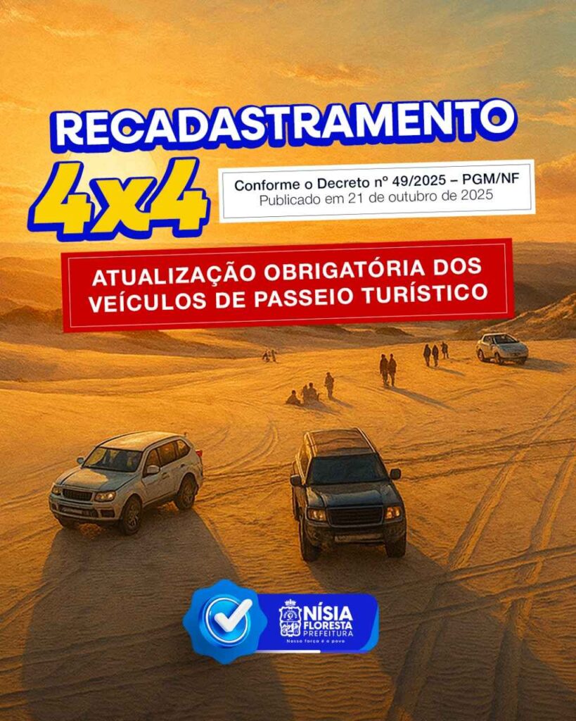 A Prefeitura de Nísia Floresta publicou o Decreto nº 49/2025, que determina o recadastramento geral dos veículos utilitários (4×4) utilizados em passeios turísticos no município. A ação, coordenada pela Secretaria Municipal de Turismo (SETUR) em conjunto com a Secretaria Municipal de Segurança Pública, Mobilidade Urbana e Defesa Civil (SESDEM), tem como objetivo atualizar os dados […]