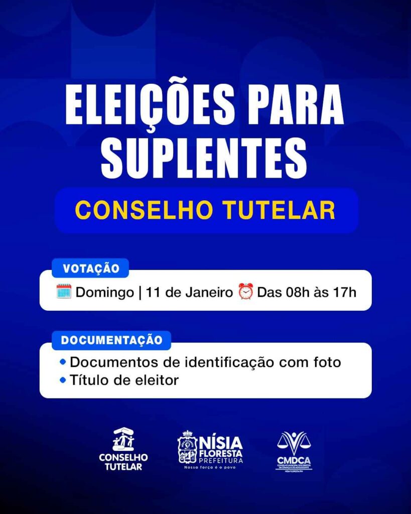 A Prefeitura de Nísia Floresta, por meio do Conselho Municipal dos Direitos da Criança e do Adolescente (CMDCA), informa à população que as Eleições para Suplentes do Conselho Tutelar serão realizadas neste domingo, 11 de janeiro, das 08h às 17h. O processo eleitoral tem como objetivo garantir a continuidade e o fortalecimento das ações de […]