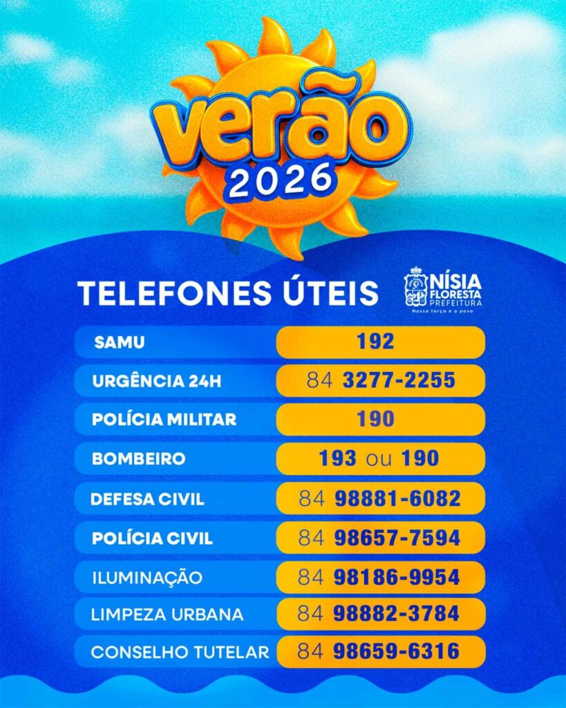 Com a chegada do Verão 2026, a Prefeitura de Nísia Floresta reforça o compromisso com a segurança, o bem-estar e a agilidade no atendimento à população e aos visitantes. Para facilitar o acesso aos serviços essenciais, foi disponibilizada uma lista atualizada de telefones úteis, incluindo saúde, segurança, emergência e serviços urbanos. Em caso de necessidade, […]