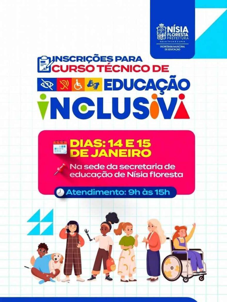 A Prefeitura Municipal de Nísia Floresta, por meio da Secretaria Municipal de Educação, torna público o Edital nº 01/2026, que abre 100 vagas para o Curso Técnico de Educação Inclusiva, destinado à formação de profissionais qualificados para atuar no atendimento educacional inclusivo na rede municipal.