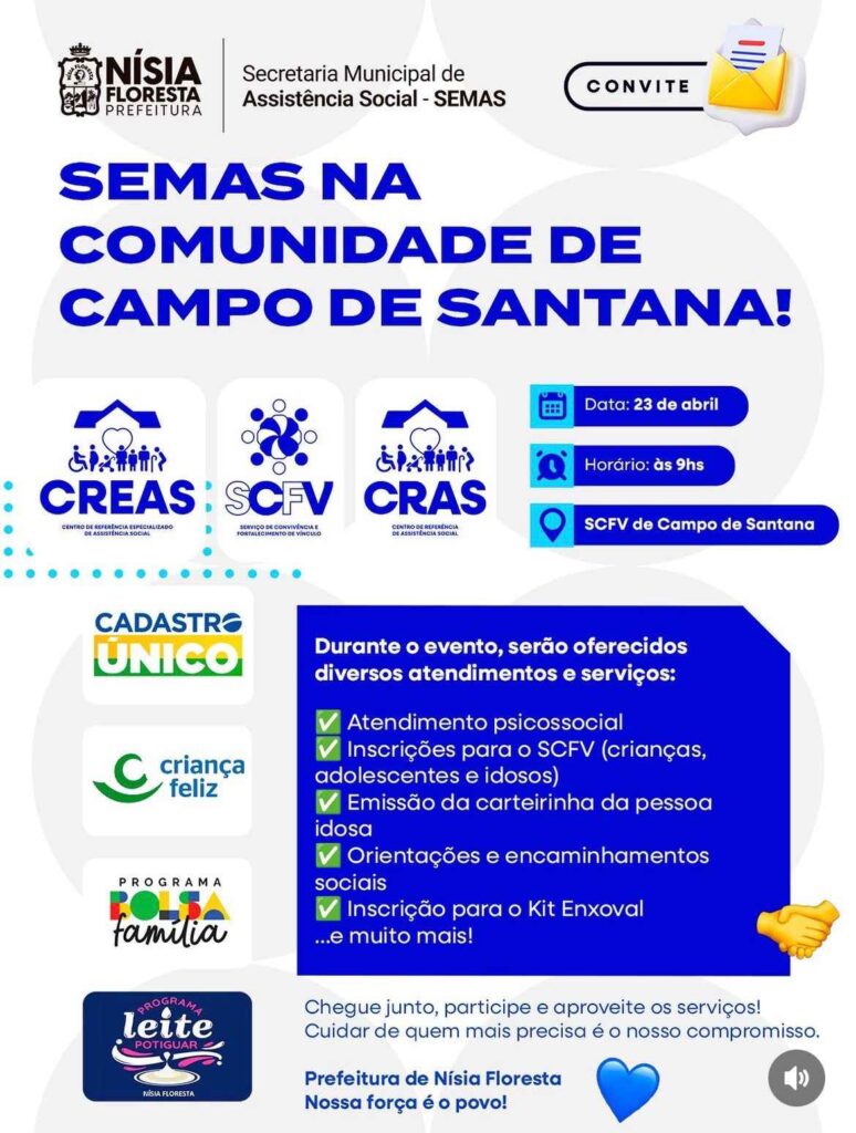 Nísia Floresta dá mais um passo no fortalecimento das políticas públicas de assistência social. A Prefeitura, por meio da Secretaria Municipal de Assistência Social (SEMAS), realiza nesta quinta-feira, 23 de abril, a ação “SEMAS na Comunidade”, na localidade de Campo de Santana.